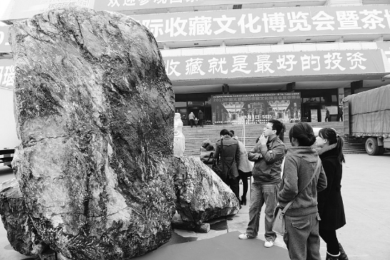 3月1日,參觀者在展場(chǎng)觀賞重達(dá)11.9噸的巨型“泰山玉王”。當(dāng)日,2012太原國際收藏文化博覽會(huì)暨茶博會(huì)在中國煤炭博物館開幕,來自國內(nèi)的參展商展出了珠寶玉石、奇石書畫、瓷器紫砂、紅木家具、茶葉等上百種收藏品。(來源:山西日?qǐng)?bào))