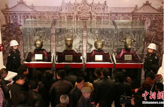 3月31日,“2012保利圓明園國(guó)寶暨南北朝佛像展”開幕式在杭州蕭山區(qū)隆重舉行。1860年,英法聯(lián)軍火燒圓明園,萬園之園付與一炬,珍惜文物慘遭流變,其中十二生肖國(guó)寶不知所蹤。圖為此次在杭州展出的圓明園豬首、牛首、虎首、猴首。(來源:中新網(wǎng))
