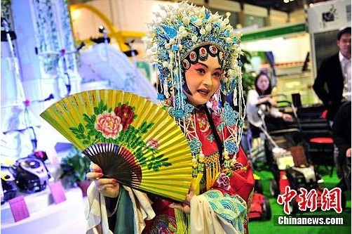 4月12日,一位學(xué)京劇的學(xué)生在北京展覽館的“第十四屆中國(guó)國(guó)際花卉園藝展覽會(huì)”上為觀眾演出《貴妃醉酒》中的精彩唱段。(來(lái)源:中新網(wǎng))