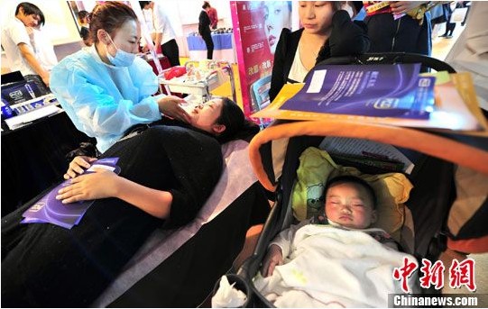 4月17日,一位“愛美媽媽”在展會上接受免費(fèi)美容服務(wù),她帶著的孩子在一旁的嬰兒車內(nèi)呼呼大睡。當(dāng)日,“2012北京國際美容美發(fā)化妝用品博覽會”在中國國際展覽中心開幕,眾多女士前來參加活動,排隊(duì)等待享受免費(fèi)美容化妝的服務(wù)。(來源:中新網(wǎng))