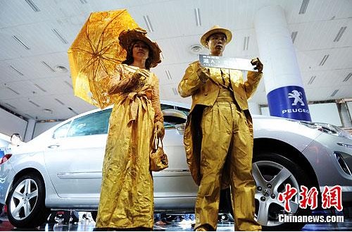 5月3日,以“樂享生活”為主題的2012湖南車展在湖南國際會展中心開幕。參展商們?yōu)槲M者,各想奇招。在某品牌汽車展區(qū)前,兩位裝扮成活體雕塑的人手拿車牌進(jìn)行促銷,吸引了眾多消費者的眼球。(來源:中新網(wǎng))