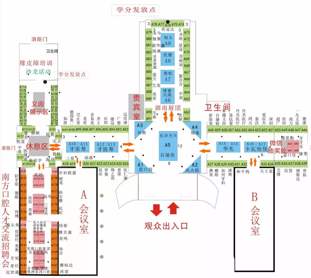 A會(huì)議室、B會(huì)議室、湖南展團(tuán)區(qū)、人才招聘區(qū)、義齒展示區(qū)、微信抽獎(jiǎng)區(qū)、沙龍活動(dòng)區(qū)、休息區(qū)、學(xué)分發(fā)放點(diǎn)