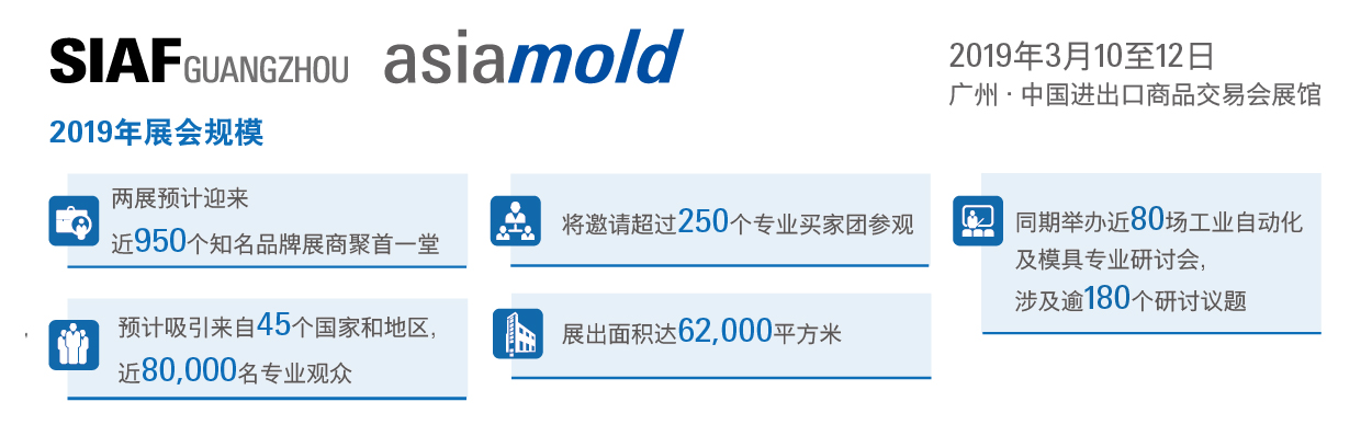 第十三屆廣州國(guó)際模具展覽會(huì)(Asiamold)于2019年3月10至12日再度在廣州中國(guó)進(jìn)出口商品交易會(huì)展館舉行,聯(lián)手SIAF廣州國(guó)際工業(yè)自動(dòng)化技術(shù)及裝備展覽會(huì),兩展將共同展示貫穿從模具、3D打印、智能制造,到生產(chǎn)自動(dòng)化的工業(yè)生產(chǎn)鏈,助力業(yè)界開拓“中國(guó)制造2025”戰(zhàn)略所帶來的龐大商機(jī)。。