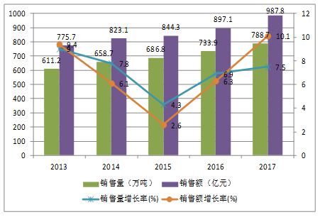 圖1 2013-2017年膠粘劑與密封劑的銷售量、銷售額及增長率