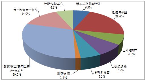 膠粘劑應(yīng)用市場增長最快的應(yīng)用領(lǐng)域是建筑/施工/民用工程/裝飾工藝,占總應(yīng)用市場的30%,而包裝與標簽用膠占21.6%,木工和細木工制品用膠占14.0%,交通運輸用膠占7.7%。纖維加工、裝配作業(yè)、紙加工及書本裝訂、制鞋和皮革這四個領(lǐng)域,分別占5.5?6.7%之間。