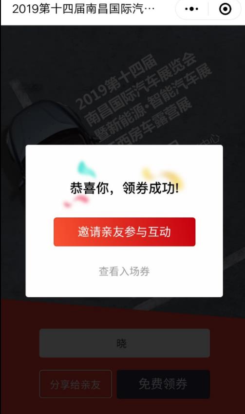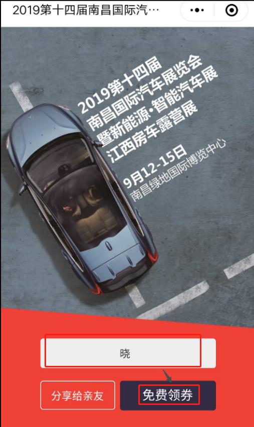 1、識(shí)別圖中“南昌國際車展”小程序碼,輸入昵稱點(diǎn)擊“免費(fèi)搶券”允許小程序授權(quán)微信;