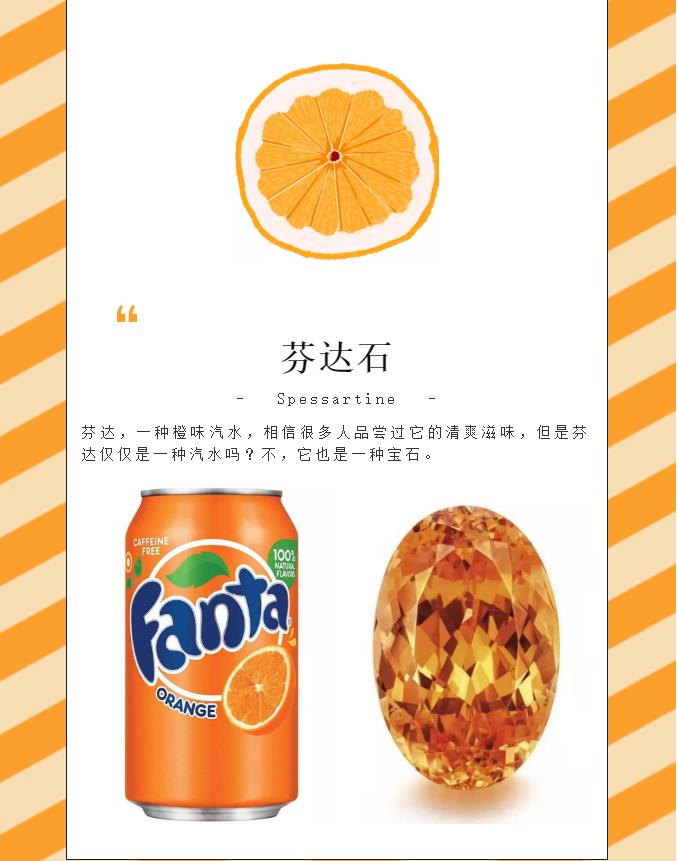 后來經(jīng)研究鑒定,發(fā)現(xiàn)這其實是一種含錳鋁元素的石榴石,任何用化學(xué)、地理或顏色來命名的方法,顯然不足以形容它明艷燦爛的顏色。最后,一種代表快樂趣味的橙味汽水名字被它成功借用——Fanta,芬達之于芬達石,堪稱天作之合。