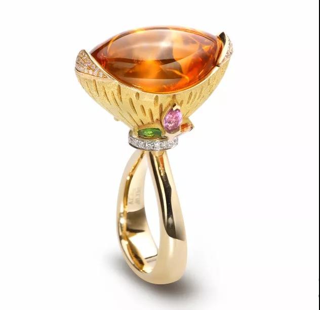 芬達石的致色元素是鐵和錳,決定它能夠呈現(xiàn)出猶如芬達般純凈鮮艷而又明亮的橙色,使得它在歐美市場受到熱烈歡迎。不少知名的珠寶品牌,如今都開始采用優(yōu)質(zhì)的芬達石作為創(chuàng)作靈感,設(shè)計了一系列夢幻的珠寶作品。