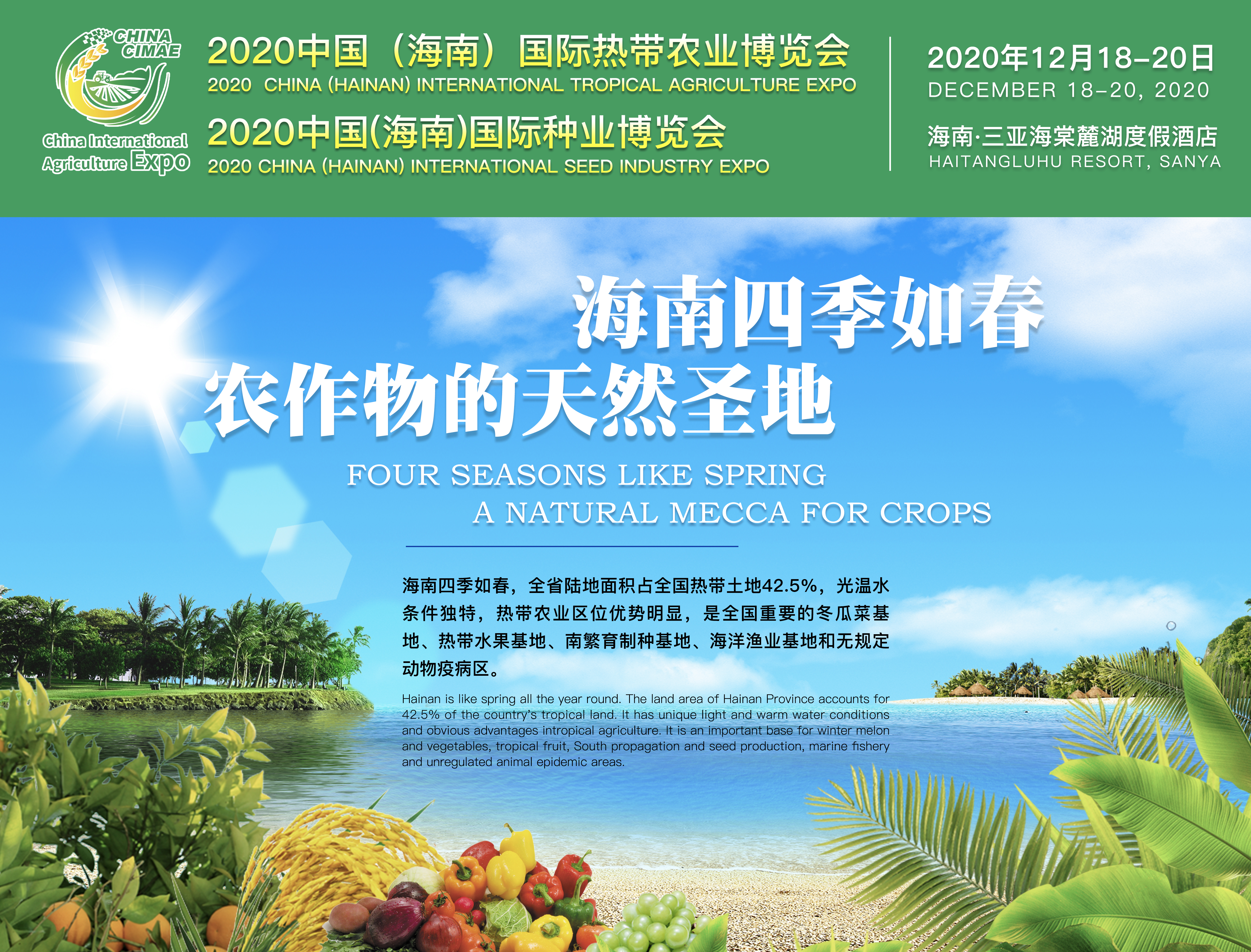 內(nèi)容摘要:農(nóng)業(yè),是關(guān)系國計(jì)民生的產(chǎn)業(yè),政府工作報(bào)告中明確提出:促進(jìn)農(nóng)林牧漁業(yè)和種業(yè)創(chuàng)新發(fā)展,加快建設(shè)現(xiàn)代農(nóng)業(yè)產(chǎn)業(yè)園和特色農(nóng)產(chǎn)品優(yōu)勢區(qū),穩(wěn)定和優(yōu)化糧食生產(chǎn)。2020年伊始,全國各行各業(yè)遭遇新冠肺炎疫情影響,對我國農(nóng)業(yè)發(fā)展以及目標(biāo)實(shí)現(xiàn)造成了重大困難。如何將疫情對“三農(nóng)”影響降到最低,保證糧食等重要農(nóng)產(chǎn)品穩(wěn)產(chǎn)保供,成為上至政府、下至市場、各相關(guān)企業(yè)面臨的一道重要課題。國家商務(wù)部為支持會展業(yè)快速發(fā)展,出臺文件并提出13項(xiàng)具體要求。海南國際熱帶農(nóng)業(yè)博覽會作為海南省唯一的農(nóng)業(yè)高新技術(shù)、生產(chǎn)資料交流貿(mào)易平臺,為積極應(yīng)對肺炎疫情、助力農(nóng)業(yè)發(fā)展,特推出“商旅+食宿一條龍會展新模式”。