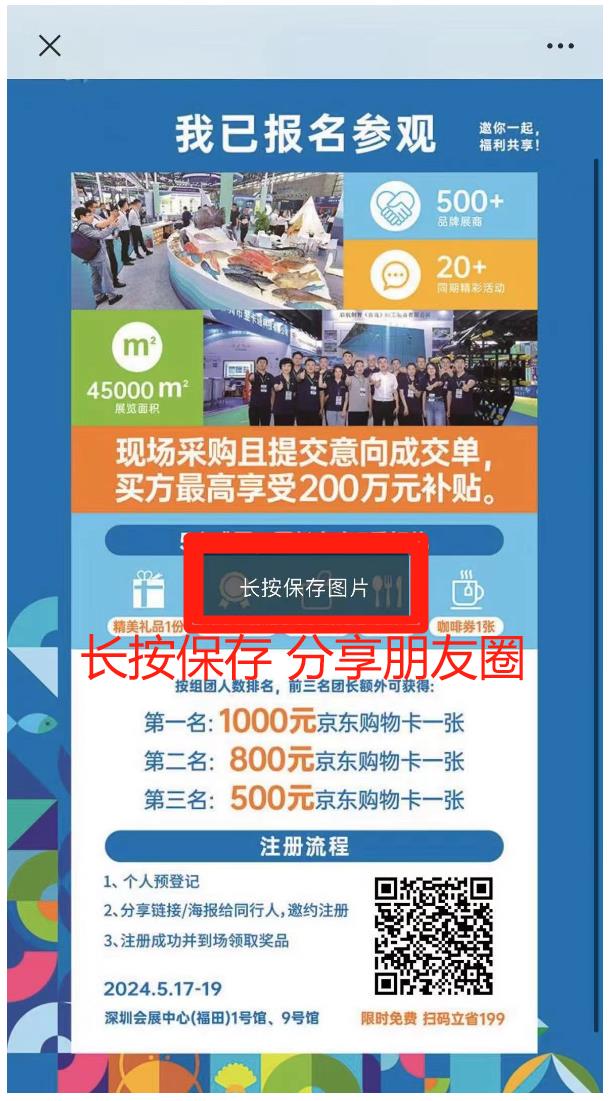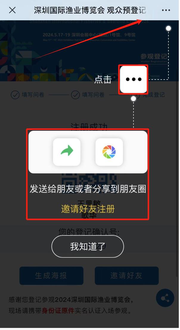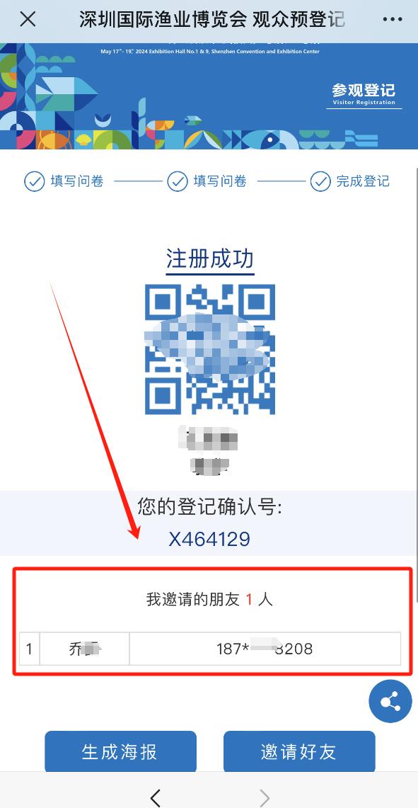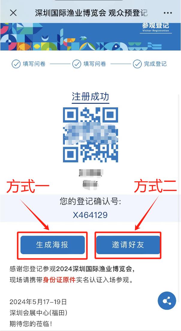 點擊“深圳漁業(yè)博覽會公眾號-免費領(lǐng)票”菜單欄,完成個人注冊后選擇【生成海報】,長按保存分享;或者選擇【邀請好友】,分享鏈接給同事/好友/朋友圈。