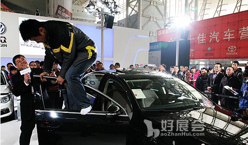 展會上的參展商們?yōu)榱送其N自己的汽車各想奇招。在會展中心的一展區(qū)內(nèi),參展商邀請參觀者爬上汽車表演“活人踩車”,以展示本車的牢固性,從而來招攬客戶購車。