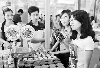 臺灣名品博覽會近日在廣西南寧市開幕,共展出2萬多個臺灣優(yōu)質商品。圖為臺灣特色商品展柜,吸引眾多參觀者駐足。4月舉辦的大陸展會中,“臺灣板塊”最吸睛。