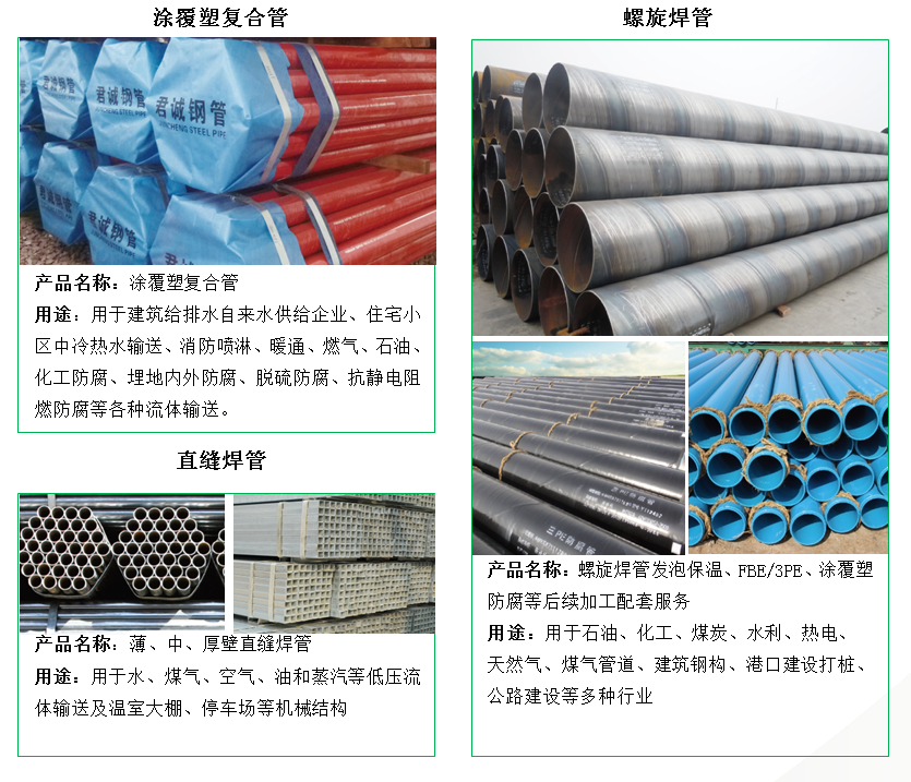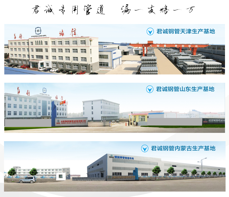 君誠(chéng)管道集團(tuán)是中國(guó)制造業(yè)企業(yè)500強(qiáng)、中國(guó)民營(yíng)企業(yè)制造業(yè)500強(qiáng)和中國(guó)產(chǎn)地名牌產(chǎn)品企業(yè)。集團(tuán)公司總部在北京,產(chǎn)銷基地坐落在——天津蔡公莊工業(yè)園區(qū)、山東焦橋南部工業(yè)園區(qū)和內(nèi)蒙古包頭九原工業(yè)園區(qū)。各子公司總占地近800畝,資產(chǎn)總計(jì)二十余億元,擁有熱鍍鋅鋼管生產(chǎn)線16條、直縫焊接鋼管生產(chǎn)線20條、襯塑復(fù)合管生產(chǎn)線11條、涂覆塑復(fù)合管生產(chǎn)線6條、螺旋縫雙面埋弧焊鋼管生產(chǎn)線6條、方矩鋼管生產(chǎn)線5條,以及預(yù)涂覆熱浸鋅鋼管、管接件等其他生產(chǎn)制造設(shè)施。君誠(chéng)管道在全國(guó)產(chǎn)品行業(yè)規(guī)模綜合處于前列,制定中國(guó)鋼管國(guó)家標(biāo)準(zhǔn)——《低壓流體輸送用焊接鋼管》(GB/T3091)、國(guó)家電網(wǎng)系統(tǒng)《輸電線路鋼管塔用直縫焊管》、《直縫電焊鋼管》(GB/T13793)、《國(guó)家電網(wǎng)特高壓輸電線路用管》、《給水涂塑復(fù)合鋼管》(CJ/T 120)、《國(guó)家排水用小螺距鋼塑復(fù)合用管》、《內(nèi)襯內(nèi)覆不銹鋼復(fù)合鋼管管道工程技術(shù)規(guī)程》、《鋼塑復(fù)合管》(GB/T28897)等標(biāo)準(zhǔn)。年設(shè)計(jì)生產(chǎn)能力Φ21-Φ219mm熱鍍鋅鋼管120萬噸、Φ21-Φ273mm直縫焊管180萬噸、Φ219-Φ3020mm螺旋鋼管30萬噸、鋼塑復(fù)合管20萬噸、方矩鋼管20萬噸,以及預(yù)涂覆熱浸鋅鋼管、管接件等各類管道和其他相關(guān)產(chǎn)品年制造能力近400萬噸。
