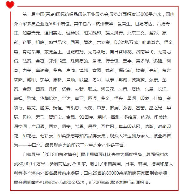 第十屆中國(青島)國際紡織品印花工業(yè)展覽會,展覽總面積逾15000平方米,國內(nèi)外百家參展企業(yè)近500個展位。其中包含:杭州宏華、愛普生、世紀(jì)方達(dá)、臺灣奇正、如皋天元、溫州碧宏、誠赫瓏、陽光酷印、瑞文風(fēng)青、北京三義、益彩、贏彩、企亞、旭峰、盛世昆侖、同晉、騰達(dá)、惠立彩、DC德弘萬成、咔咻激光、恒金鼎、青島銘洋、東莞至上、世紀(jì)威揚(yáng)、無錫眾旺、向日葵印花、濟(jì)南華飛、無錫冠伍、弘泰、金豪、鄭州鴻盛、珠海墨的、晨曦、傳美訊、藍(lán)宇、富多彩、迅鐳、利宣、力美、鑫速彩、鼎亮、點(diǎn)滴、博越、富圖、端彩、福諾新、端彩、亮新、東方軟圖、誠印、東華、康橋、昌順、聯(lián)盟、粵彩、聯(lián)泰,邦葳、葳新葳、弘康、金泰、金蔥、酋泰、凡印、億鑫、赤新、聯(lián)成、海云花、決策、震達(dá)、東晨、長江、赫姆、雅域、華騰怡德、全達(dá)、南亞、四通、鼎金、恒興、星河、印象、佳境、彩噴行、鼎亮、涵濤、瑞恒、吉凱恩、天茂、中意、御瀾、弘創(chuàng)、富蕾、星之光、華辰、貝拉、天馬、智匯寶、金晟、91圖庫、榮彬、福鼎、多維康、絢彩、印美達(dá)、源空間、廣印通、西立、恒安、希恩、昌盈、瓦欄網(wǎng)、集萃印花網(wǎng)、浩瀚、時尚印花、印花社、七彩云、印染雜志等知名品牌云集,觀眾人次達(dá)到萬余人。被業(yè)界譽(yù)為——中國北方最具影響力的印花工業(yè)生態(tài)全產(chǎn)業(yè)鏈平臺。