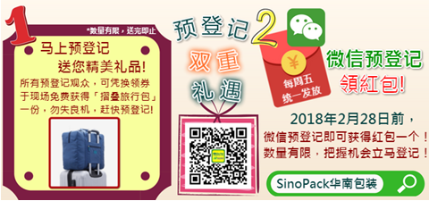 參展商名單現(xiàn)已上載至展會官方網(wǎng)站,觀眾可預(yù)先上網(wǎng)查看參展商名單并于網(wǎng)上進(jìn)行預(yù)先登記。預(yù)先登記觀眾更可享有免費(fèi)換領(lǐng)大會會刊和折迭旅行袋禮品、優(yōu)先參加現(xiàn)場專題研討會及免除現(xiàn)場登記手續(xù)等優(yōu)惠。立即到展會網(wǎng)頁www.ChinaSinoPack.com 或 www.PACKINNO.com進(jìn)行預(yù)先登記,觀眾預(yù)登記截止日期為2018年3月4日。