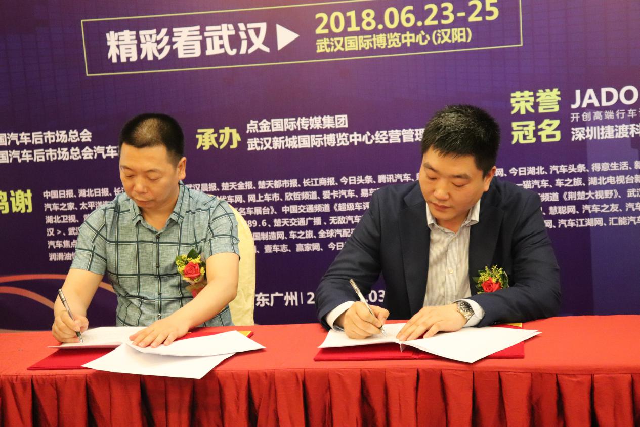 隨后的戰(zhàn)略簽約和戰(zhàn)略授牌儀式中,首先是點(diǎn)金傳媒譚校長(zhǎng)與JADO捷渡智能(中國(guó))王杰董事長(zhǎng)兩位代表正式簽約,宣布雙方達(dá)成2018武漢展及后續(xù)的戰(zhàn)略合作。