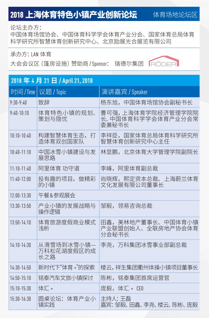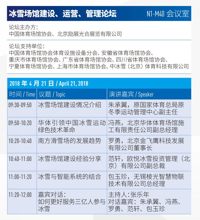 明天21日主題特色論壇“冰雪場(chǎng)館建設(shè)、運(yùn)營、管理論壇”和“2018上海體育特色小鎮(zhèn)產(chǎn)業(yè)創(chuàng)新論壇”,也將分別于N1-M40會(huì)議室和館內(nèi)體育場(chǎng)地論壇區(qū)舉辦。