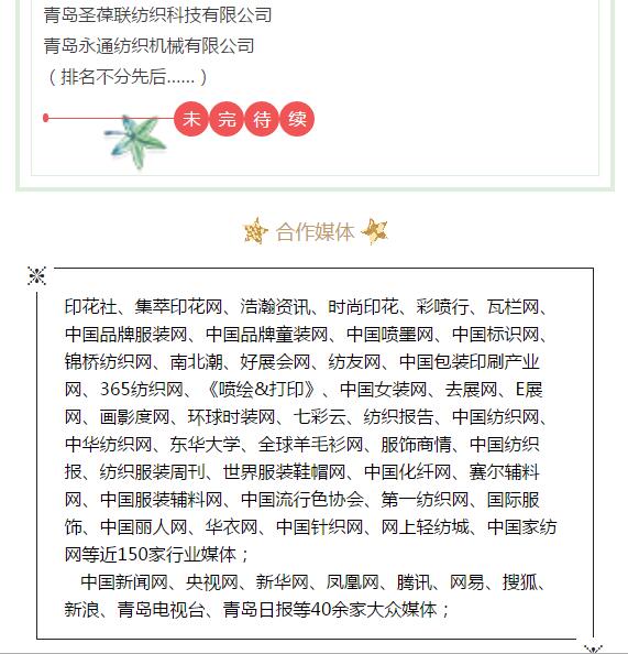 青島印花展現(xiàn)已報(bào)名上百家企業(yè),我們已邀約專業(yè)觀眾5000+家的企業(yè)(印花廠、印染廠、貿(mào)易公司、設(shè)計(jì)師、家用紡織品制造廠等),還有100+家新聞媒體進(jìn)行跟進(jìn)報(bào)道。我們會(huì)給您進(jìn)行最好的宣傳,和您一起占據(jù)市場(chǎng)!