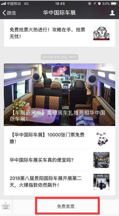 第一步:進(jìn)入“華中國(guó)際車展”官方微信,點(diǎn)擊菜單欄“免費(fèi)索票”