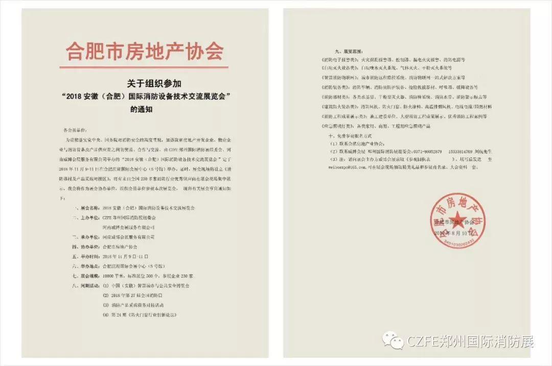 由威博會(huì)展|CZFE鄭州國(guó)際消防展組委會(huì)舉辦的“2018安徽(合肥)國(guó)際消防設(shè)備技術(shù)交流展覽會(huì)”將于2018年11月9日-11日在合肥濱湖國(guó)際會(huì)展中心(5號(hào)館)召開(kāi),合肥市房地產(chǎn)協(xié)會(huì)作為協(xié)辦單位之一直接參與消防展籌備,并下達(dá)舉辦安徽(合肥)國(guó)際消防展《通知文件》。
