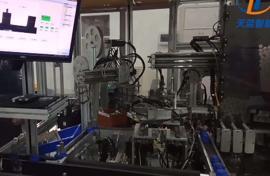 電芯入殼--既電芯裝入鋼殼的過程。天藍(lán)智能的入殼機,采用功能模塊化設(shè)計,配備多功能圖像識別、360%無極激光測控技術(shù)以及柔性輸送線,可實現(xiàn)單機雙工位凸輪連桿傳動,兼容單雙極耳卷芯,確保無損傷同軸導(dǎo)向入殼。