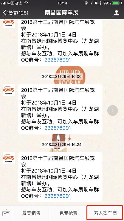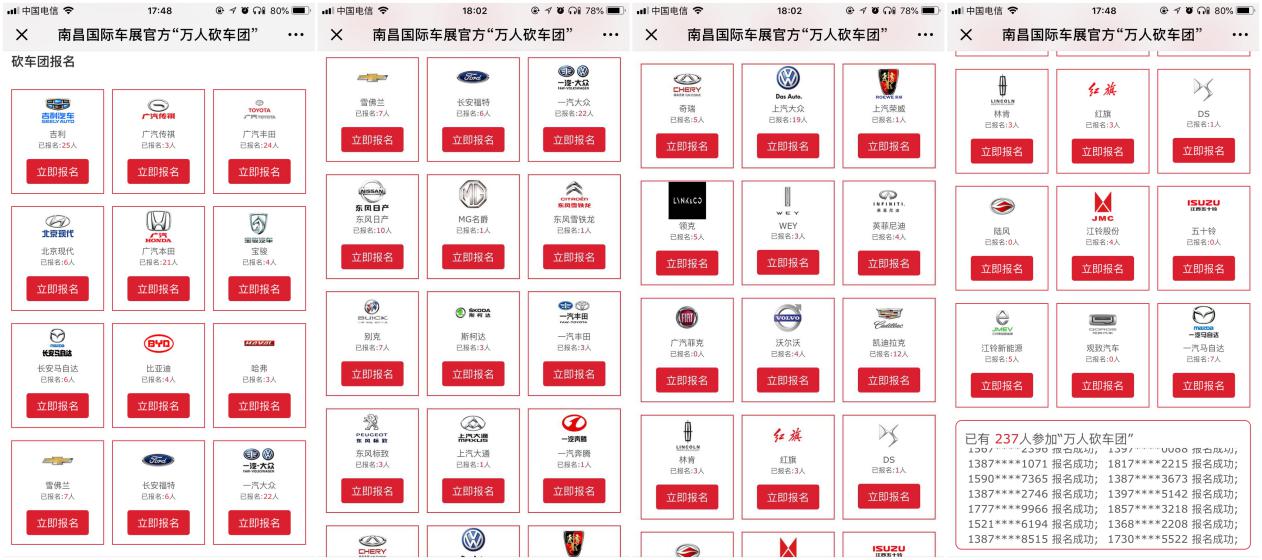 1、即日起至9月30日,通過微信關(guān)注“南昌國際車展”,點(diǎn)擊【萬人砍車團(tuán)】按鈕進(jìn)入專題,選擇喜歡的汽車品牌即可免費(fèi)報名參加“南昌國際車展官方萬人砍車團(tuán)”活動(每人限報一個砍車團(tuán));