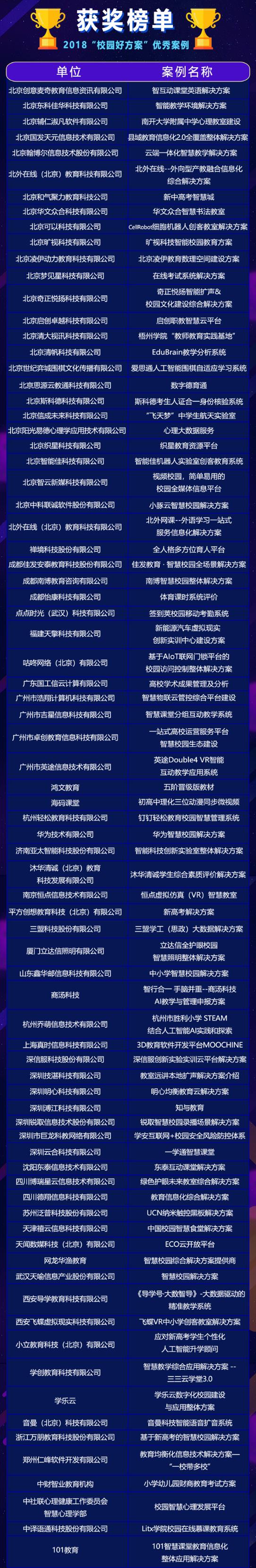 是不是按奈不住激動的內(nèi)心了?本次將首輪公布“第五屆校園好方案”評選活動——“2018智慧教育優(yōu)秀案例企業(yè)”榜單,內(nèi)容如下,看看你上榜了嗎?