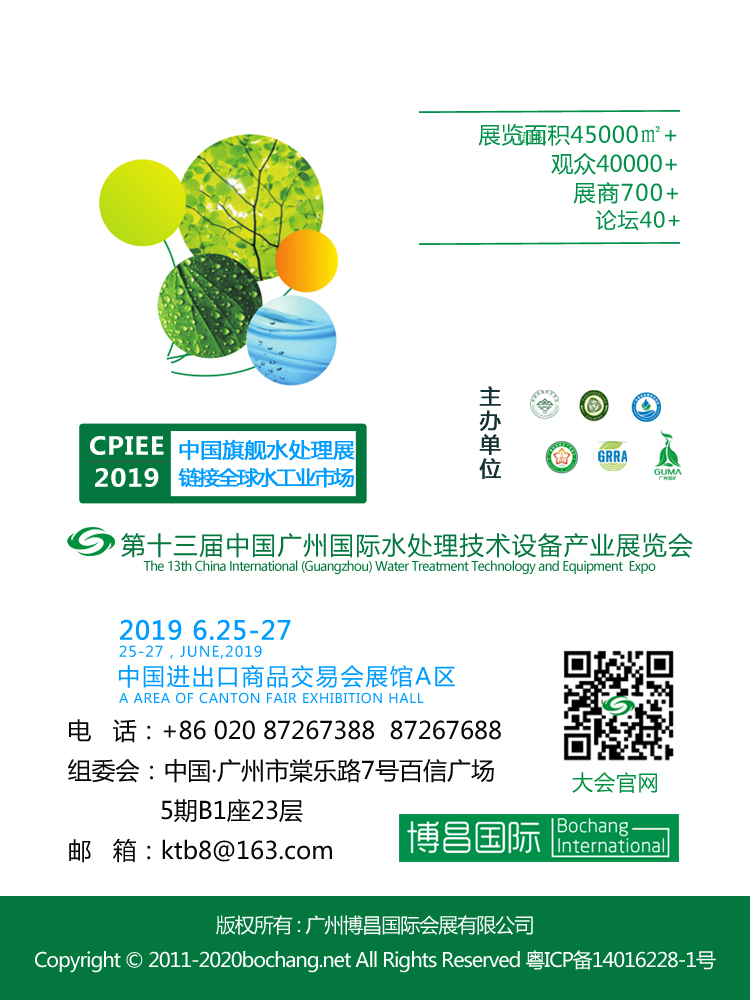 第十三屆中國國際廣州水處理技術(shù)設(shè)備展覽會暨2019“一帶一路”環(huán)保創(chuàng)新創(chuàng)業(yè)大會于2019年6月25-27日在廣交會展館A區(qū)隆重舉辦!以“對接粵港澳大灣區(qū) 鏈接全球環(huán)保市場”為主題,將憑借華南及粵港澳大灣區(qū)如此強大的市場優(yōu)勢,以高實效為原則,貼近市場、服務(wù)客商,為展商開發(fā)多級市場,鏈接全球水工業(yè)市場商機!這一屆的展會規(guī)模、品質(zhì)、衍生服務(wù)再次全面升級,45000㎡展示規(guī)模,預(yù)計吸引700多家品牌企業(yè)參展及4萬名專業(yè)觀眾參觀,全面展示水與污水處理技術(shù)設(shè)備、泵管閥、膜與海水淡化、雨水收集與利用/洪水控制、黑臭水體防治及河域治理、水質(zhì)監(jiān)測、環(huán)境服務(wù)等水工業(yè)全產(chǎn)業(yè)鏈的前沿技術(shù)與最佳解決方案。同期40多場高規(guī)格、高標(biāo)準(zhǔn)的專業(yè)學(xué)術(shù)論壇,展會影響力深度擴大到華南及東南亞地區(qū),促進(jìn)國際交流合作,助力水處理產(chǎn)業(yè)再添生輝。