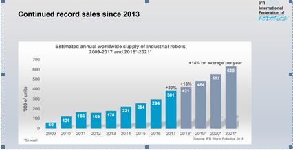 今年10月,國際機(jī)器人聯(lián)盟(IFR)在日本東京舉行的“World Robot Summit 2018”記者招待會上公布了每年都會發(fā)行的“The World Robotics Report”,根據(jù)報告顯示,全球工業(yè)用機(jī)器人領(lǐng)域投資將持續(xù)增加。從2013年到2017年,全世界工業(yè)用機(jī)器人的銷量增加了2倍,2018至2021年,年平均增長率為14%。汽車、電子、金屬工業(yè)等領(lǐng)域機(jī)器人自動化的需求持續(xù)增加,不論大企業(yè)還是中小型企業(yè)均對自動化表現(xiàn)出極大的興趣,愿意嘗試借勢機(jī)器人轉(zhuǎn)型,讓企業(yè)搭上智能制造快車。