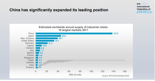 2017年,占據(jù)全球機(jī)器人市場份額73%的5個國家依次是中國、日本、韓國、美國、德國。其中,中國工業(yè)機(jī)器人的銷量達(dá)到137.9萬臺,占據(jù)了世界供應(yīng)量的36%,進(jìn)一步鞏固了第一大市場的位置。2013年至2017年,中國已連續(xù)五年成為全球最大的工業(yè)機(jī)器人應(yīng)用市場。據(jù)預(yù)計,到2020年我國機(jī)器人市場規(guī)模將進(jìn)一步擴(kuò)大到2000億元,工業(yè)機(jī)器人發(fā)展一片“火熱”景象。