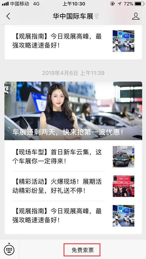 1、進(jìn)入“華中國際車展”官方微信,點(diǎn)擊“免費(fèi)索票”,填寫并提交報(bào)名信息,以便客服聯(lián)系您發(fā)送門票。