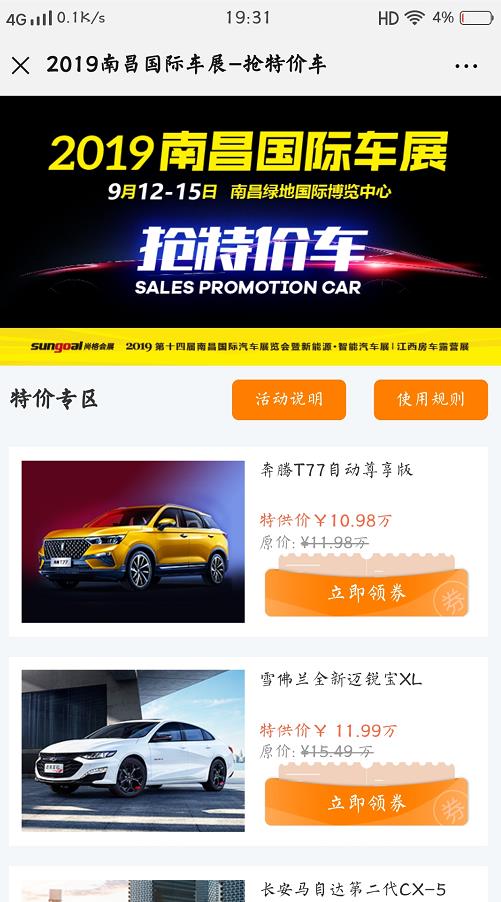 二、1)點擊【展會活動】——【特價車】菜單,選擇意向的特價車型并點擊立即報名,即可獲得專屬特價車券,保存券號;
