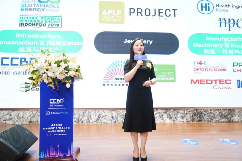 發(fā)布會首先由英富曼Informa Markets中國董事總經(jīng)理龔康康發(fā)表致辭,她指出,成都建博會與英富曼集團(tuán)牽手已經(jīng)三年了,無論是從展會的規(guī)模還是影響力上都獲得很大的提升。這次我們與中國建筑材料流通協(xié)會共同打造“燈飾照明”和“陶瓷衛(wèi)浴”兩個全新的板塊,相信一定能讓成都建博會如虎添翼,不僅保持在中西部首屈一指的地位,也將成為在全國極具影響力的重點品牌展會。