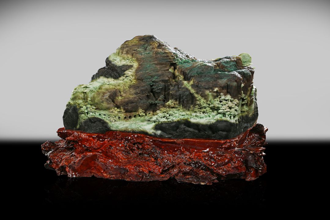 作品《巍巍太行》材質(zhì)為獨山玉,作品靈感源于自然山林。此原料為雜色獨山玉,綠、白、褐、青等顏色相互呈浸染狀或漸變過渡狀存在于同一塊體上,其塊度大,形狀似山峰。作者以此為基礎(chǔ),用巧奪天工的高超技藝雕刻出太行山勝景。借用中國山水畫中散點透視,高遠、深遠、平遠的“三遠”表現(xiàn)手法,巧用顏色體現(xiàn)前后關(guān)系以及畫面立體感。近處的樹林、橋梁、牛群、流水;遠處的庭閣、房屋、小路、云彩,以淺色表現(xiàn),比例適當、線條流暢、細節(jié)處理到位傳神,能抓住觀者第一視角。以褐、棕色表現(xiàn)山脈,突顯山脈的陡峭層疊、莊重巍峨之感,太行山的大氣磅礴與山中生活意境之美完美呈現(xiàn)。