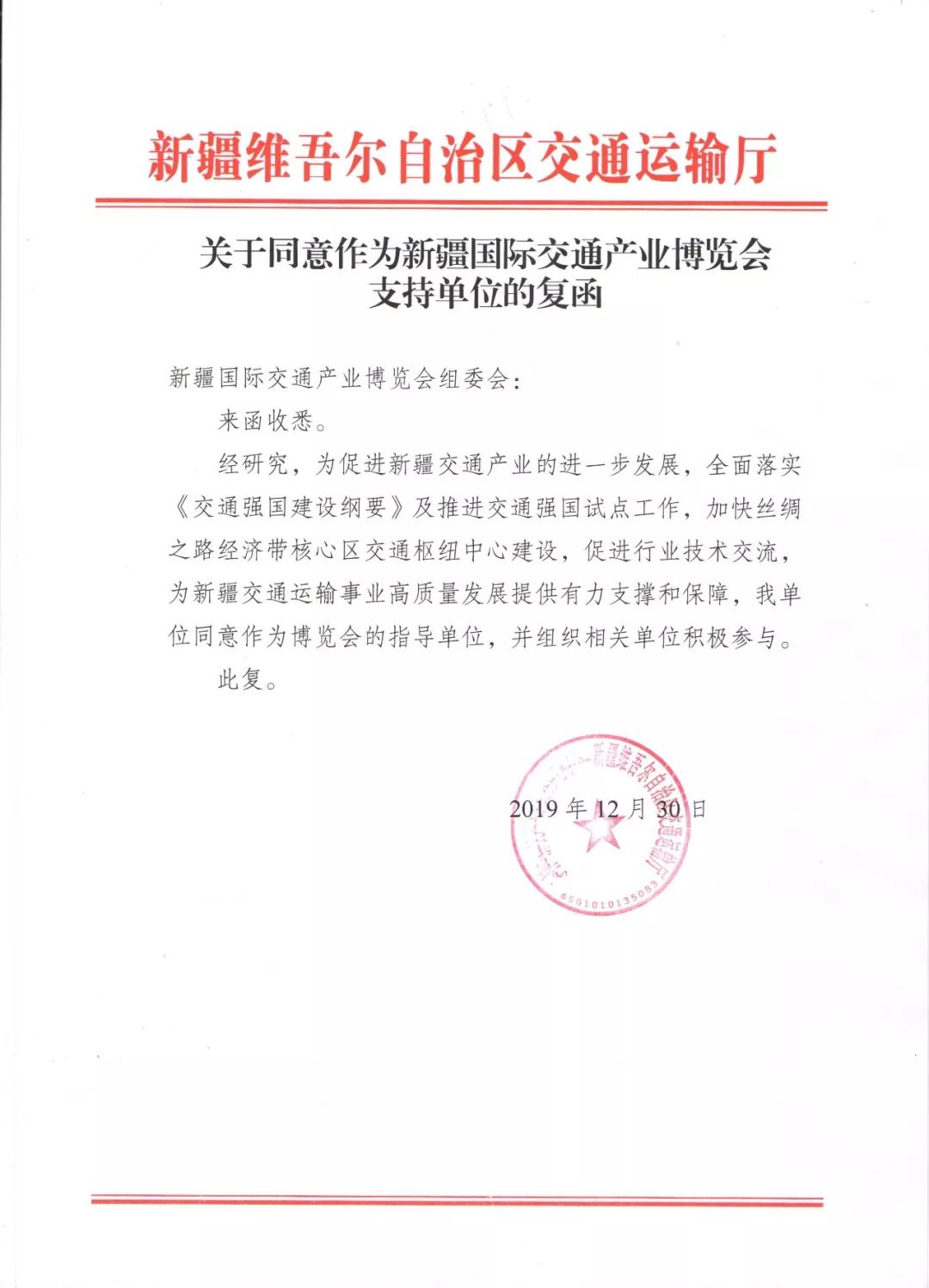 新疆維吾爾自治區(qū)交通運輸廳正式回函成為2020新疆交通國際產業(yè)博覽會支持指導單位