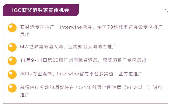 Interwine是中國(guó)最早、影響力最大的專業(yè)國(guó)際葡萄酒及烈酒展覽,旗下Interwine 葡萄酒與烈酒大獎(jiǎng)賽(簡(jiǎn)稱IGC)作為中國(guó)最權(quán)威公正的葡萄酒大賽之一,對(duì)中國(guó)葡萄酒消費(fèi)市場(chǎng)影響深遠(yuǎn)。IGC旨在對(duì)釀酒廠商勤懇勞作進(jìn)行表彰加冕,全力幫助進(jìn)入中國(guó)市場(chǎng)的國(guó)內(nèi)外酒商建立起自己的品牌知名度和美譽(yù)度,搭建釀酒者和消費(fèi)者之間的互聯(lián)互通的橋梁,推動(dòng)國(guó)際和國(guó)內(nèi)葡萄酒行業(yè)向前發(fā)展。2020 IGC已正式啟動(dòng),參賽酒款現(xiàn)正征集中。