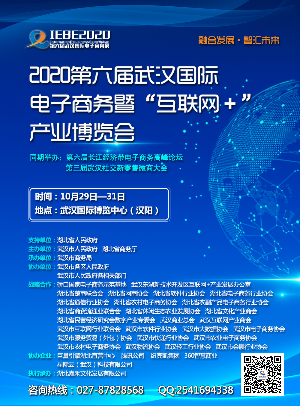 10月29日—31日,由湖北省人民政府支持,武漢市人民政府、湖北省商務(wù)廳聯(lián)合主辦,武漢市商務(wù)局承辦的2020第六屆武漢國(guó)際電子商務(wù)暨“互聯(lián)網(wǎng)+”產(chǎn)業(yè)博覽會(huì)(以下簡(jiǎn)稱武漢電博會(huì))將在武漢國(guó)際博覽中心隆重舉行。