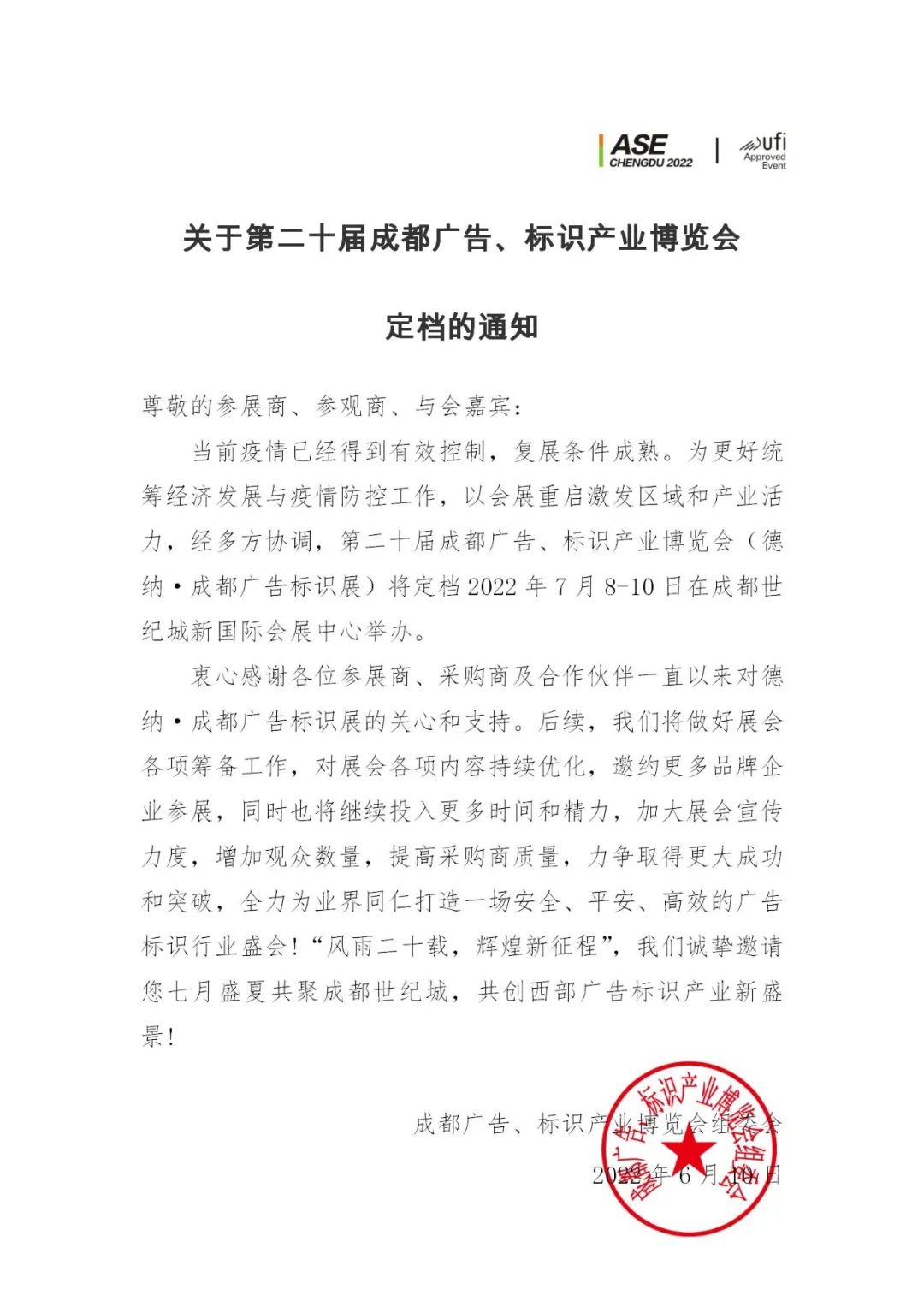 各位支持和關注德納·成都廣告標識展的朋友們,久等啦!當前疫情已經(jīng)得到有效控制,復展條件成熟為更好統(tǒng)籌經(jīng)濟發(fā)展與疫情防控工作,以會展重啟激發(fā)區(qū)域和產(chǎn)業(yè)活力,國內(nèi)多個城市恢復舉辦展會。經(jīng)多方協(xié)調(diào),第20屆成都廣告、標識產(chǎn)業(yè)博覽會定檔啦!
