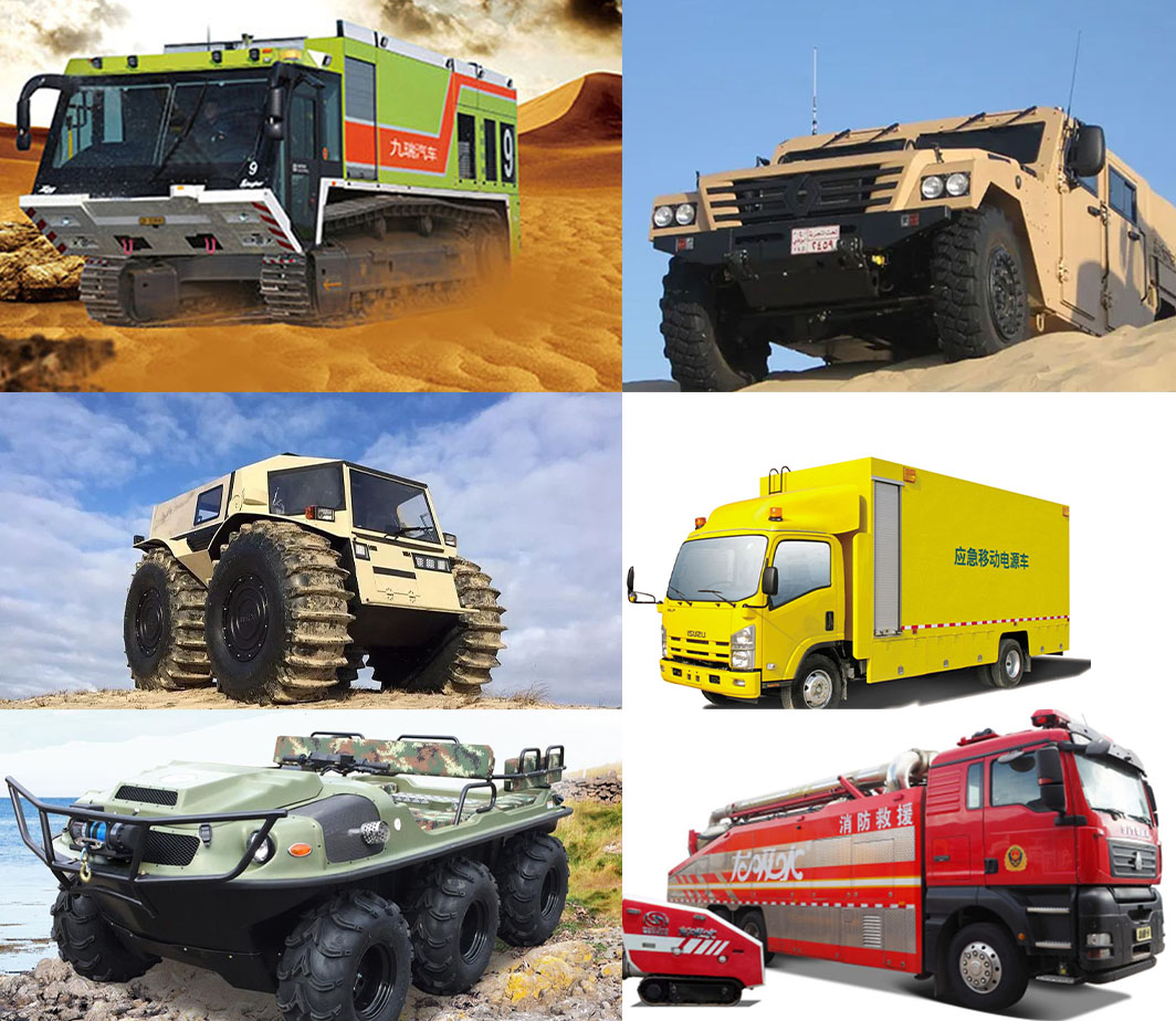 救護車、醫(yī)療車、軍警用車、商用車、指揮車、消防車、后勤保障車輛、領(lǐng)導(dǎo)專用車、多用途車(MPV)、電視轉(zhuǎn)播車、雷達車、軍事監(jiān)理車、X光檢查車、監(jiān)測車、越野車、清理除雪車、全地形車、水陸兩棲車、通信車、機場車、航天車、校車、清障車、房車、旅居車、清障車、環(huán)衛(wèi)車、市政專用車、裝卸車、工程救險車、道路救援車、防彈運鈔車、高空作業(yè)車、郵政車、起重車、攪拌車、挖掘車、推土車、油罐車、冷藏運輸車、礦用載重車、集裝箱車、工程專用車、壓路車以及不同型改裝車輛等。