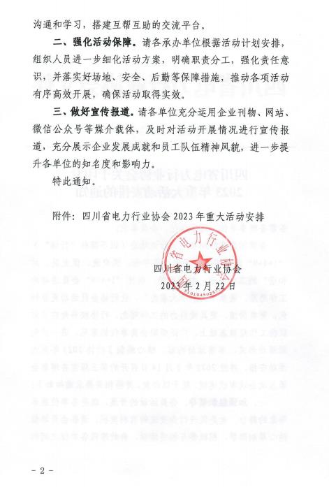 2月22日,四川省電力行業(yè)協(xié)會(huì)(簡(jiǎn)稱(chēng)“行協(xié)”)印發(fā)2023年工作計(jì)劃和重大活動(dòng)安排。2023年,行協(xié)將全面貫徹落實(shí)黨的二十大報(bào)告中提出的調(diào)整能源結(jié)構(gòu)、加快規(guī)劃建設(shè)新能源體系,確保能源安全等要求,全面發(fā)揮好協(xié)會(huì)平臺(tái)、橋梁、紐帶、主體等功能,著力開(kāi)展10項(xiàng)以上重要活動(dòng)。