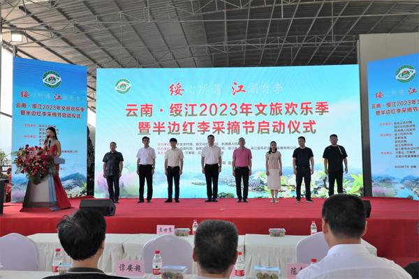 活動(dòng)現(xiàn)場(chǎng),綏江縣委常委、縣委辦主任邱崠秦同志為啟動(dòng)儀式致詞,縣人民政府副縣長(zhǎng)丁永帥同志進(jìn)行現(xiàn)場(chǎng)推介,縣委書(shū)記蘇世攀同志宣布活動(dòng)啟動(dòng),并在與會(huì)嘉賓陣陣熱烈的掌聲中,舉行了云南·綏江2023文旅歡樂(lè)季暨半邊紅李采摘節(jié)現(xiàn)場(chǎng)視頻啟動(dòng)儀式。