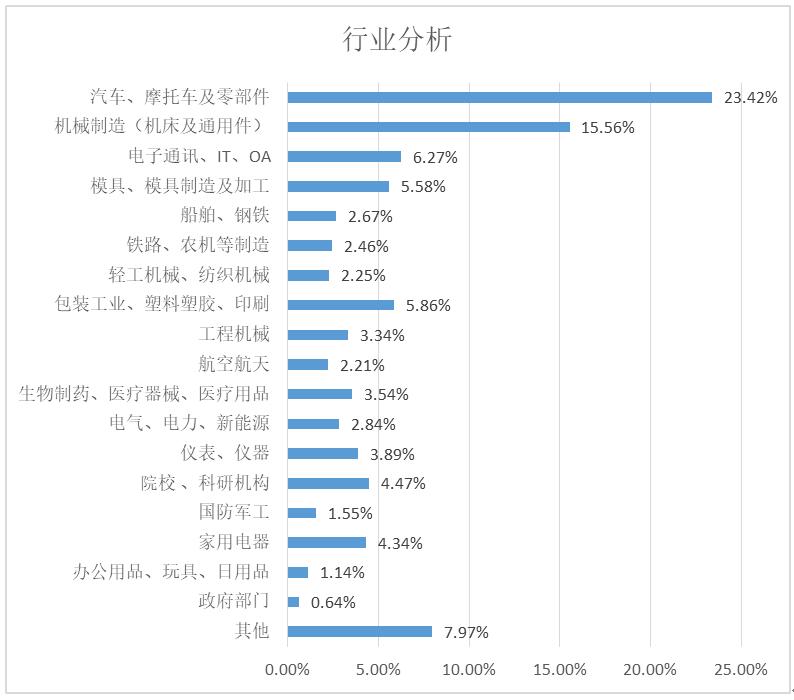 參觀展會的企業(yè)行業(yè),以汽車、摩托車及零部件企業(yè)最多,占到總數(shù)的23.42%,其次為機械制造(機床及通用件),占15.56%。此外,電子通訊、模具、船舶、鋼鐵、鐵路、農機、輕工、橡塑包裝、工程機械、國防軍工、航空航天、生物醫(yī)藥、家電等制造行業(yè)均有涉及。