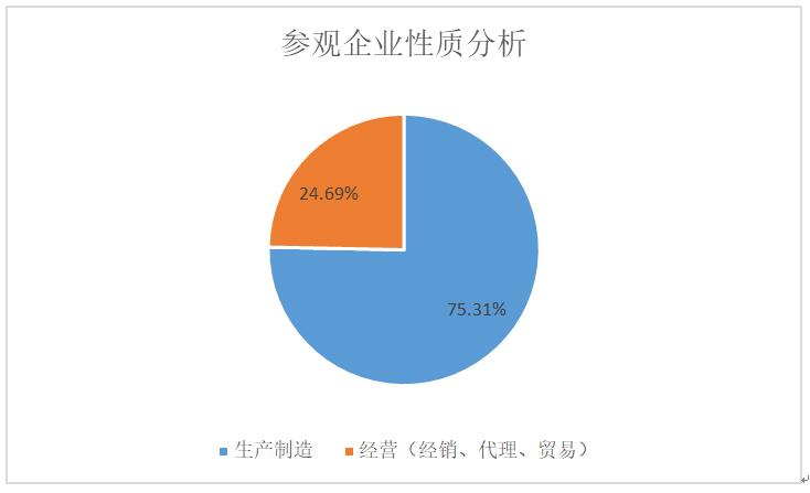 據(jù)展會組委會統(tǒng)計,本次展會參觀企業(yè)達6341家,從企業(yè)性質總數(shù)量占比來看,生產制造企業(yè)占75.31%,經(jīng)營(經(jīng)銷、代理、貿易)企業(yè)占24.69%,兩者合計占100%。由此可以看出,在參觀企業(yè)中,以生產制造企業(yè)為主,占比較大。