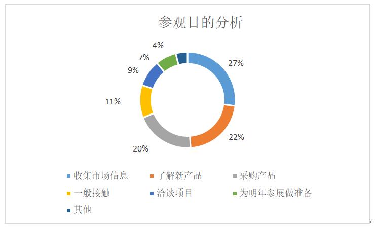 專業(yè)觀眾的參觀目的有“收集市場信息”“了解新產品”“采購產品” “一般接觸”“洽談項目”“為明年參展做準備”,比重依次降低。