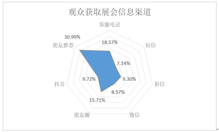 經(jīng)由微信(朋友圈、公眾號、微信群)、同行好友、打電話告知前來參觀的觀眾人數(shù)最多;其次為傳統(tǒng)紙媒、裝備嘉族;抖音、短信、微博、電視、廣播渠道也有效觸及了行業(yè)人士。