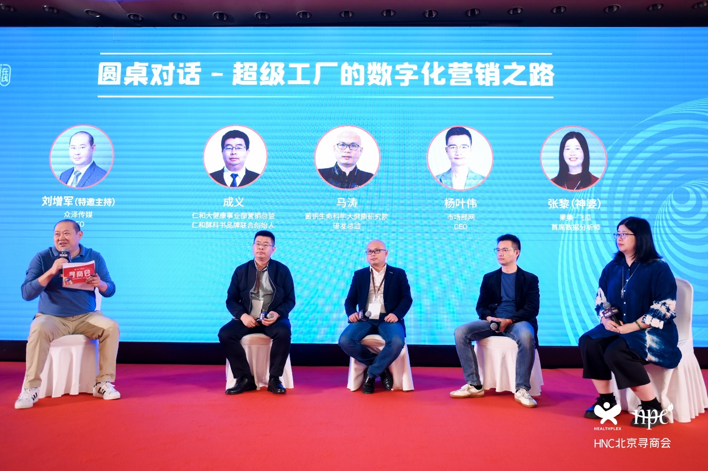 從左至右:眾澤傳媒CEO劉增軍(主持)、仁和大健康事業(yè)部營銷總監(jiān) 、仁和酵科書品牌聯(lián)合創(chuàng)始人成義、菌鑰生命科學(xué)大健康研究院研發(fā)總監(jiān)馬濤、市場部網(wǎng)CEO楊葉偉、果集•飛瓜首席數(shù)據(jù)分析師 神婆