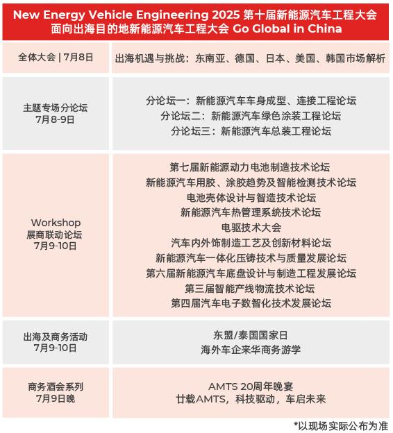 NEV Engineering 2025 第十屆新能源汽車工程大會全新出發(fā),打造:面向出海目的地的新能源汽車工程大會,結(jié)合主辦方勵展全球化汽車產(chǎn)業(yè)合作資源,預(yù)計(jì)將吸引4,000名中國及1,000名來自東南亞、日本、韓國、德國、美國、印度及其他海外目的地車企、產(chǎn)業(yè)協(xié)會園區(qū)政府機(jī)構(gòu)等領(lǐng)域的行業(yè)精英,共同探討新能源汽車車身,綠色涂裝、總裝、三電工程及零部件制造工程領(lǐng)域的前沿技術(shù)、市場趨勢、以及出海目的地的政策法規(guī)及合作機(jī)遇,為行業(yè)精英提供一個(gè)不出國門即可深度參與的國際交流盛會。