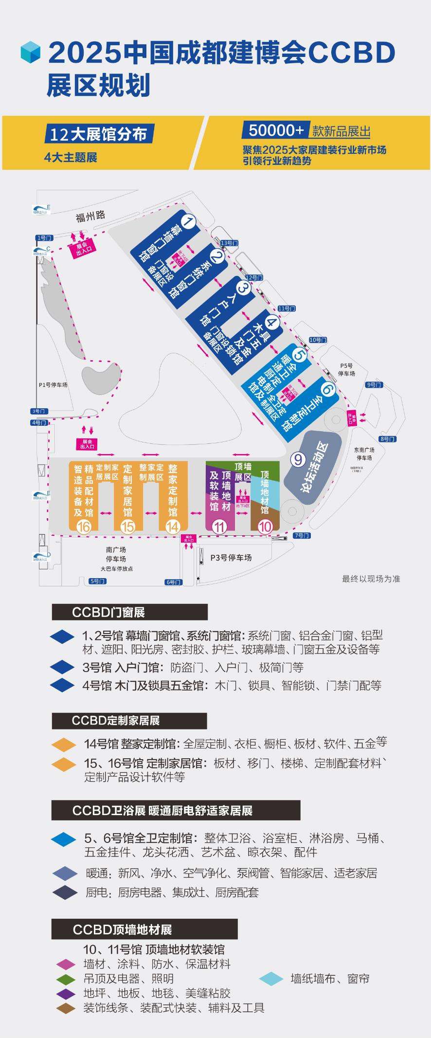 本屆展會擁有12個展館+6個連接館,全面創(chuàng)新升級展館規(guī)劃,主要分為CCBD門窗展、CCBD定制家居展、CCBD全衛(wèi)定制及暖通廚電展、CCBD頂墻地材展,分類更加清晰明了。