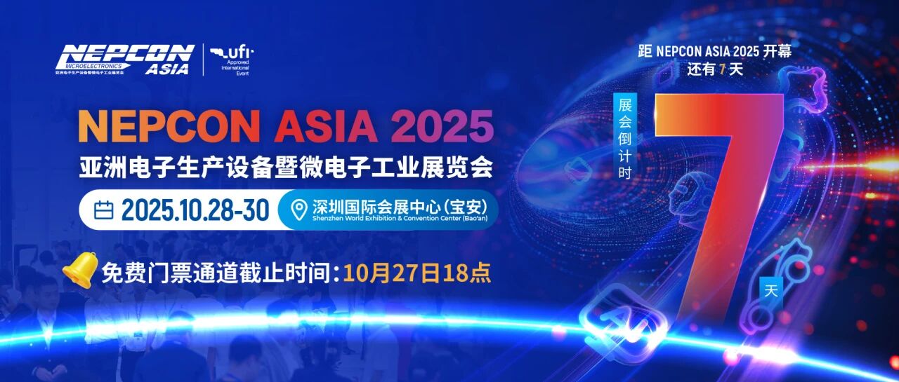 電子展:倒計時7天!NEPCON ASIA 2025重磅發(fā)布眾多亮點展區(qū)、40場高端論壇、新品首發(fā)及前沿方案,搶先登記免費領(lǐng)100元門票