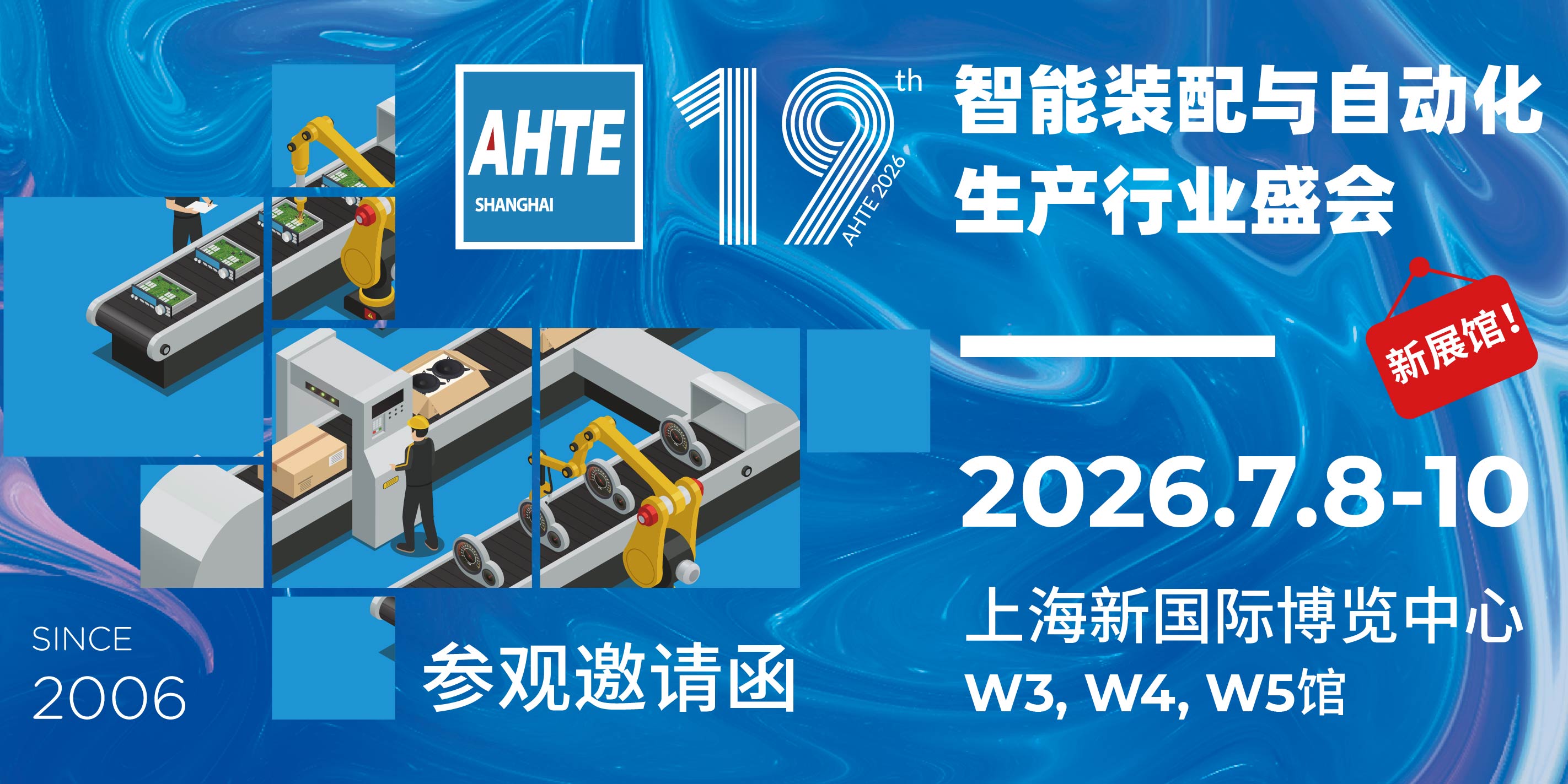 AHTE 2026展館煥然一新,將首次在上海新國際博覽中心W3,W4,W5館舉辦,您將可以直接從2號入口大廳快速入場,體驗(yàn)多行業(yè)智能裝配與自動(dòng)化生產(chǎn)的非凡魅力。
